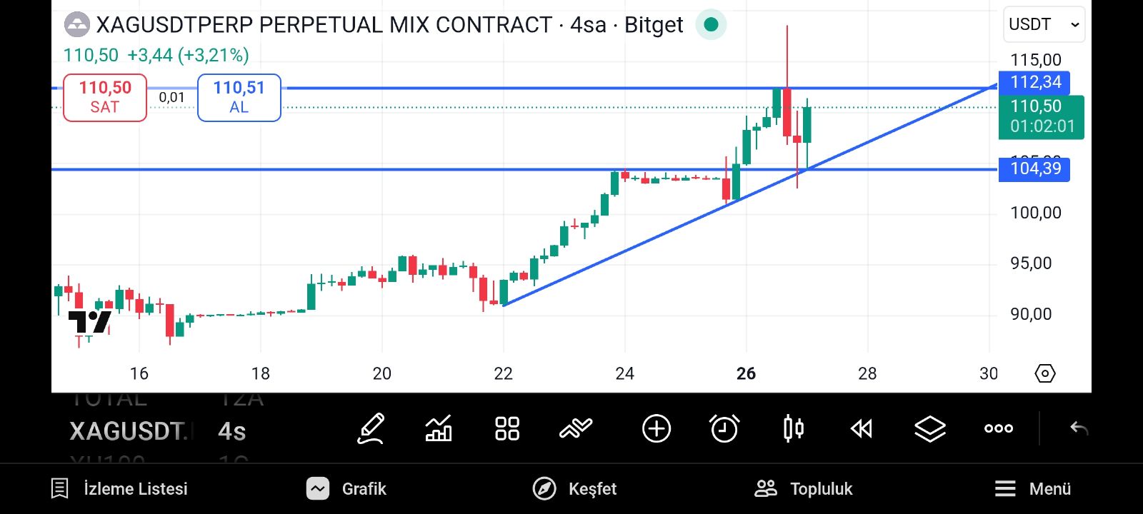 4h da 104.39 altında kapatmadığı sürece sıkıntı yok yukarıda 112.34 var hareketin hızlanması için 112.34 üzeri 4h kapanışlar lazım