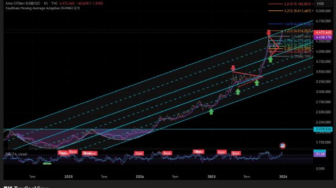Ons Altın uzun vadeden gelen Reg. kanalı hedefi zamansallıkla 5600* Grafikte (5598.7 görülen en yüksek rakam)tam nokta atışı vuruldu fibonacci direnç 5577*seviyesin den red yedi