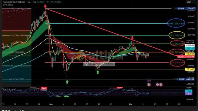Geçen hafta Zirveden gelen düşeni ve fibo %50 seviyesi 92.8 kapanış alamayınca destekleri yokladı Ons gümüş fibonacci 86 direncini aşamdıkca alt destekler grafikte
