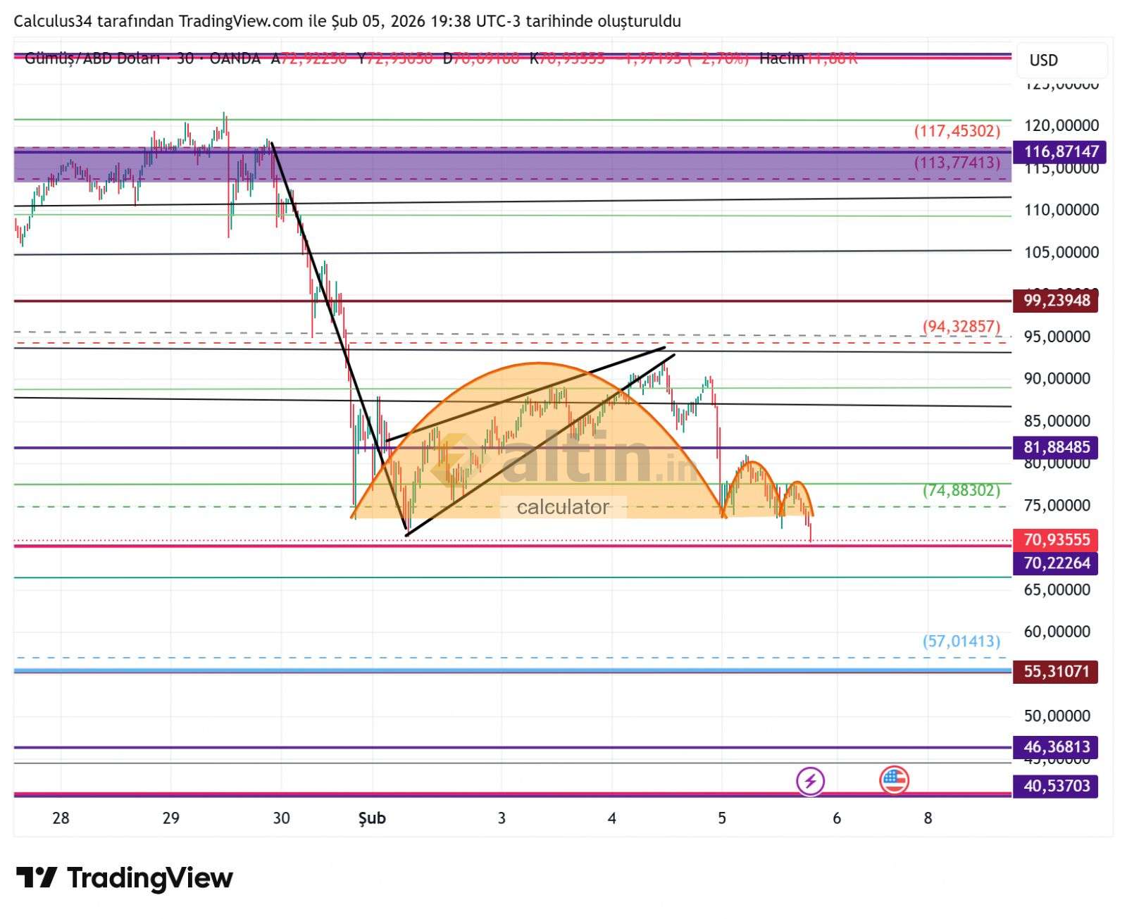 calculator @Hayalet_adam daha önce attığım ters flama aktif durumdadır. Son durumda ters flamanın altında 30dklıkta ters sin formasyonu oluşumu vardır. Ters sin formasyonu oluşumun iptal olabilmesi için 74,88 gann zaman direncinin üstünde kapanışlar yapmalıdır. Bu değer üstünde kapanış yapmaz ise ters sin formasyonu hedefi ve sonrasında ters flama hedefi haline gelebilir. Bu sebeple 74,88 değeri üstüne atmasını önemsiyorum