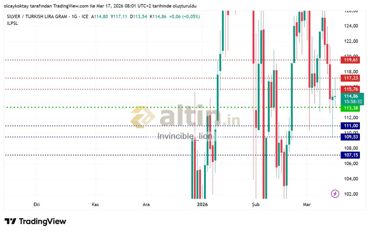 gümüş gram tl günlük pivot 113.38 destekler 111.00 109.53 107.15 dirençler 115.76 117.23 119.61