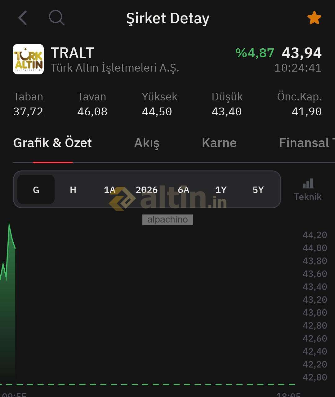 Altınla eş değer tepki veren ve altının biraz kldıraclı kardesi tralt altın madeni hssesini dün altın yukselir düşüncemle pozsyon almıştım bugün artı7 yi gördüğünde sattım ve pozisyonu kapattım(artı7 olursa sat ve cık serhi ile girdim)