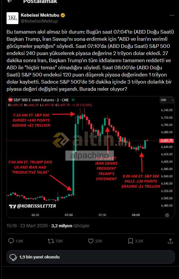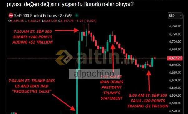 Trmp'ın açıklamasından 5 dakika önce: Tek seferde 1,5 milyr dlarlık nominal değerde S&P500 (ES) vdeli işlmleri stın alındı. 192 milyn dlarlık nominal değerde ptrol vdeli işlmleri (CL) stıldı. Piysa kapanışı sırasındaki diğer tüm işlemlerin 4-6 katından fazla. İçeriden bilgi sahibi olanlar, gün ışığında onun yalanlarından kazanc elde etti
