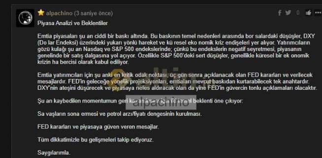 Gram Altın için alpachino yorumu ()@ipekcy ekran görüntüsüne bakın aslında paylastım ancak söylediklerini yaptım bosluk bıraksamda sayfaya düsmüyor.o sebeple harf değişiyorum.