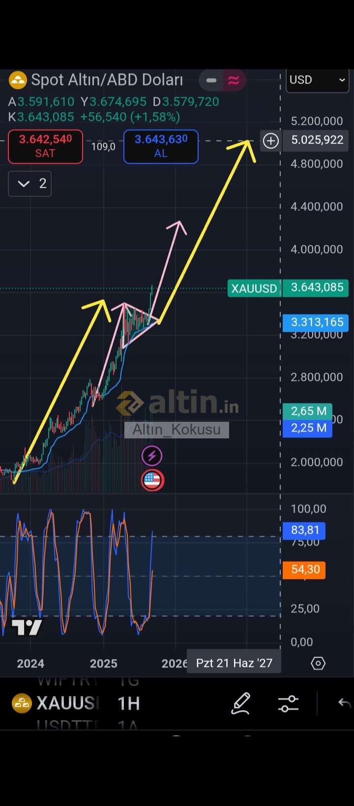 Gümüş için Altın_Kokusu yorumu ()altın ons 5000 civarı düzeltmezse 5350 usd civarı majör direncine ulaşmak ister fazla da bir şey kalmadı ama belli olmaz. Yaklaşık 1 ay önce de yazdığım gibi gümüşü de çekebilir çekebildiği kadar gümüş yaklaşık 4.618 majör direnci olan 102-103 seviyesinde çok yakınsadı. ytd