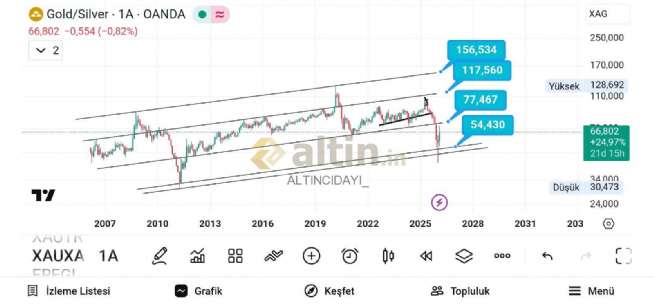 Bakkal hesabıyla 1 gr Altın kaç gram gümüş ediyorun grafiği. Burada mumlar yani fiyat aşağı doğru düşerae gümüş altın karşısında kıymetlenir. Hani metaller fırlarken altın yüzde 2 yaparken gümüş yüzde 5-6 yapıyorduya işte o zaman grafik aşağı düşüyordu. Şimdi sayo yükseliyor gümüşün kıymeti azalıyor bu sebeple altından daha çok düşüyor