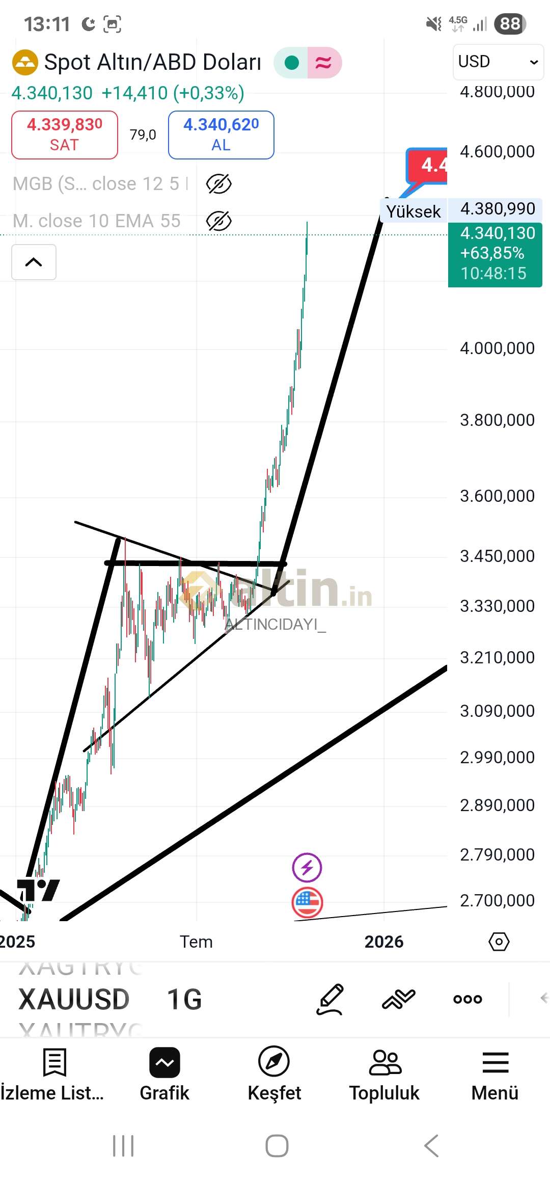4350 güzelcene kırıp taban oldumu 4600 / 4700 / 5000 e kadar gitme olasığı var ama bu 3. Flama hedefiydi 2026 da bekliyodum.