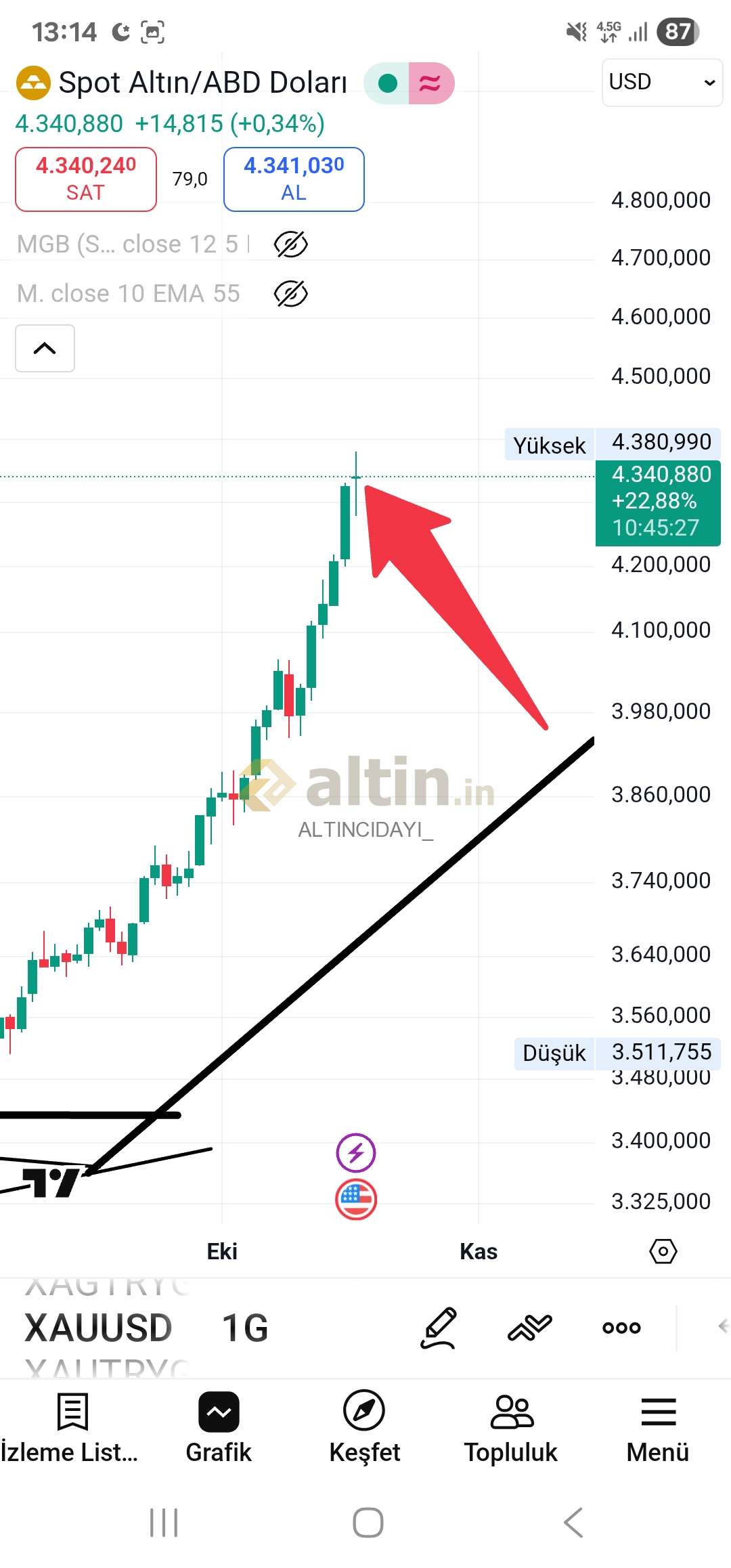 ALTINVURUŞ38 (4 gün önce)Birçok yerde Altın almaya gidenlere altın yok deniliyor Japonya'sı vs. Şimdi düşürdüler güya Onsu almak için bekleyenleri ucuzdan mallandırırlarmı sizce bence hayır en geç Pazartesi sabah 4300 lerdeyiz benim düşüncem 50-100 dolar lık düşüşler yapıp korku vermeye çalışıyorlar demiştim şimdi daha bir korku verip küçük yatırımcının Piskolojisi ile oynayıp dökme Peşindeler Panik olan kalır birkaç haftaya çok arar o gönderdiği gramları bilesiniz izleyip göreceğiz..