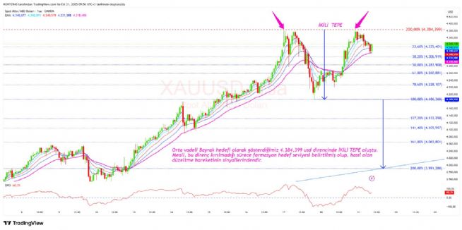 Ons Altın kısa vadeli oluşturduğu ters flama içinde E dalgasını yapıyor, düşüşün ilk günü de belirttiğim ve halen aşılamayan düşüşün 0,382 fibo katsayısı olan 4,148- usd direncini 2 kez test etti ve kıramadı, bu kez E dalgası ile 3. kez ulaşabilirse test edecek ve E dalgası da sonlanacak, sonrasını takip edelim.