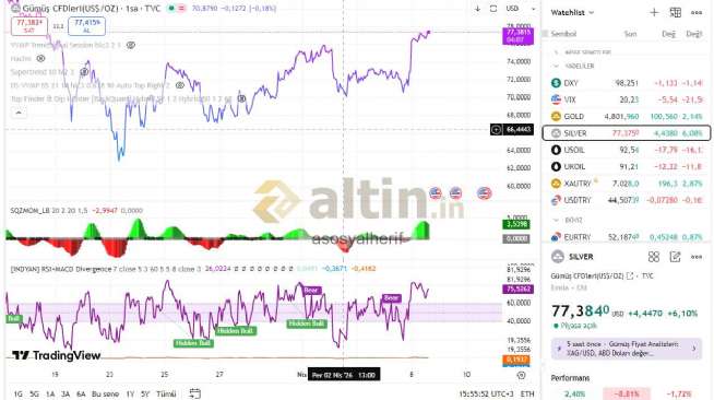Gümüş için asosyalherif yorumu ()bende bi tane gösterge var fibonacci ve hacime göre dip tepe hesaplıyor , isabetli de. şuan dip seviye gümüşte 76.30 gösteriyor 15dklıkta.
