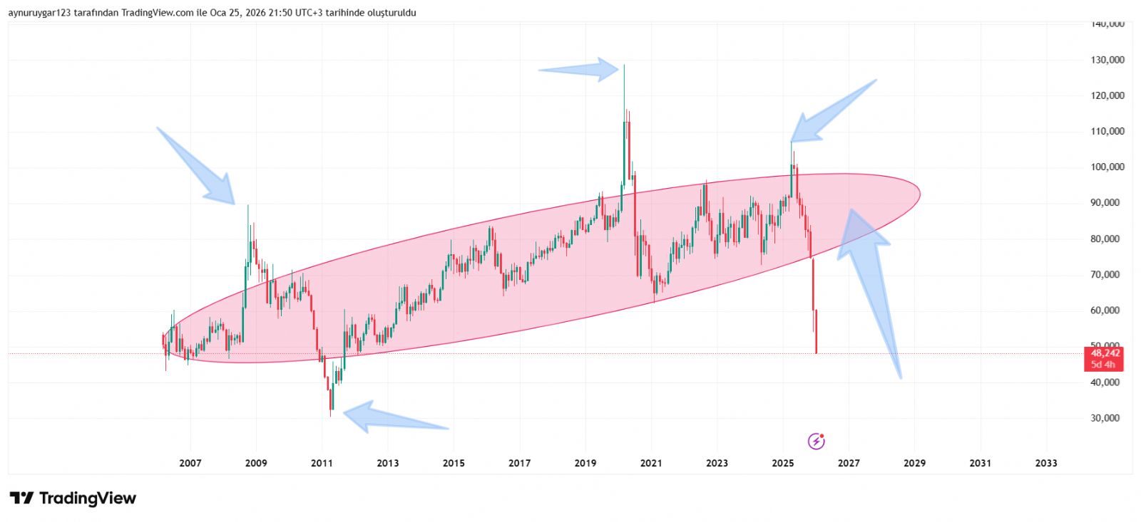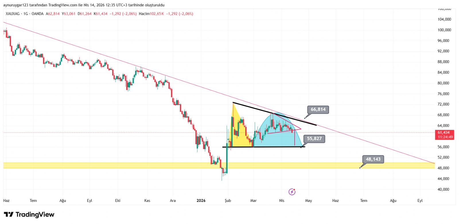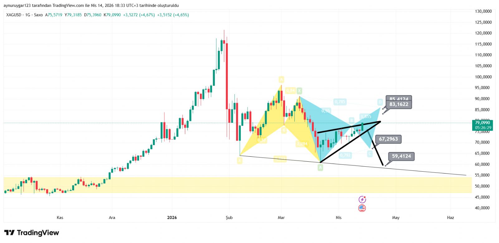 7. ons gümüş 2026 yıl icinde 84 altina inmemeli . yoksa 6 aylık yıllık mum fitile dönüşebilir.