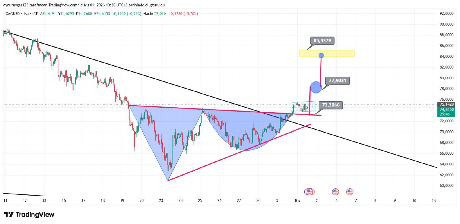 Gümüş için Aynur1 yorumu ()evet . yeni bankadan ayrı hesap açip al sat yapmak daha mantıklı bu aralar .. geçen 67..69 stoplu 77...82 hedefli alınabilir demiştim .