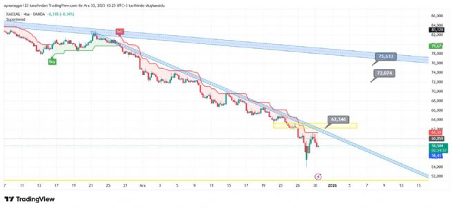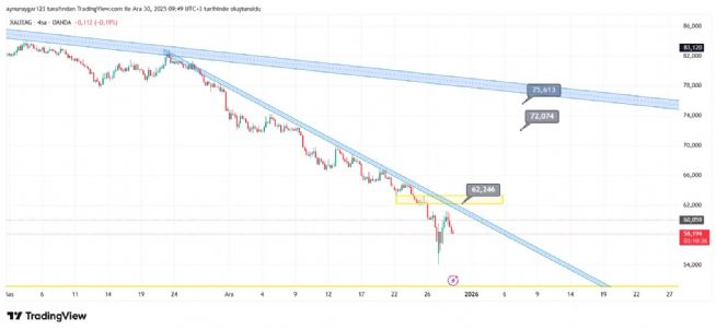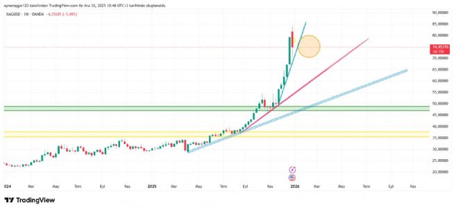misal sen nerden alırdın dersiniz o küçük mavi trend kırılacak bana göre bir yerde ..esas o kirmizi ana trene yatlaştiğinda kademe alırdım ...2026 yil içinde ne zaman gelir bilmem amma orası boşluk ..boş yanı mumlar ile doldurması gerekır ...şu an 70 kırılmadan o trend kırılmadan yine düşer diyemem .amma 70 altı giderse 10 dolar daha düşeriz ...ytd