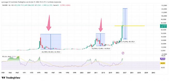 7. ons gümüş 2026 yıl icinde 84 altina inmemeli . yoksa 6 aylık yıllık mum fitile dönüşebilir.