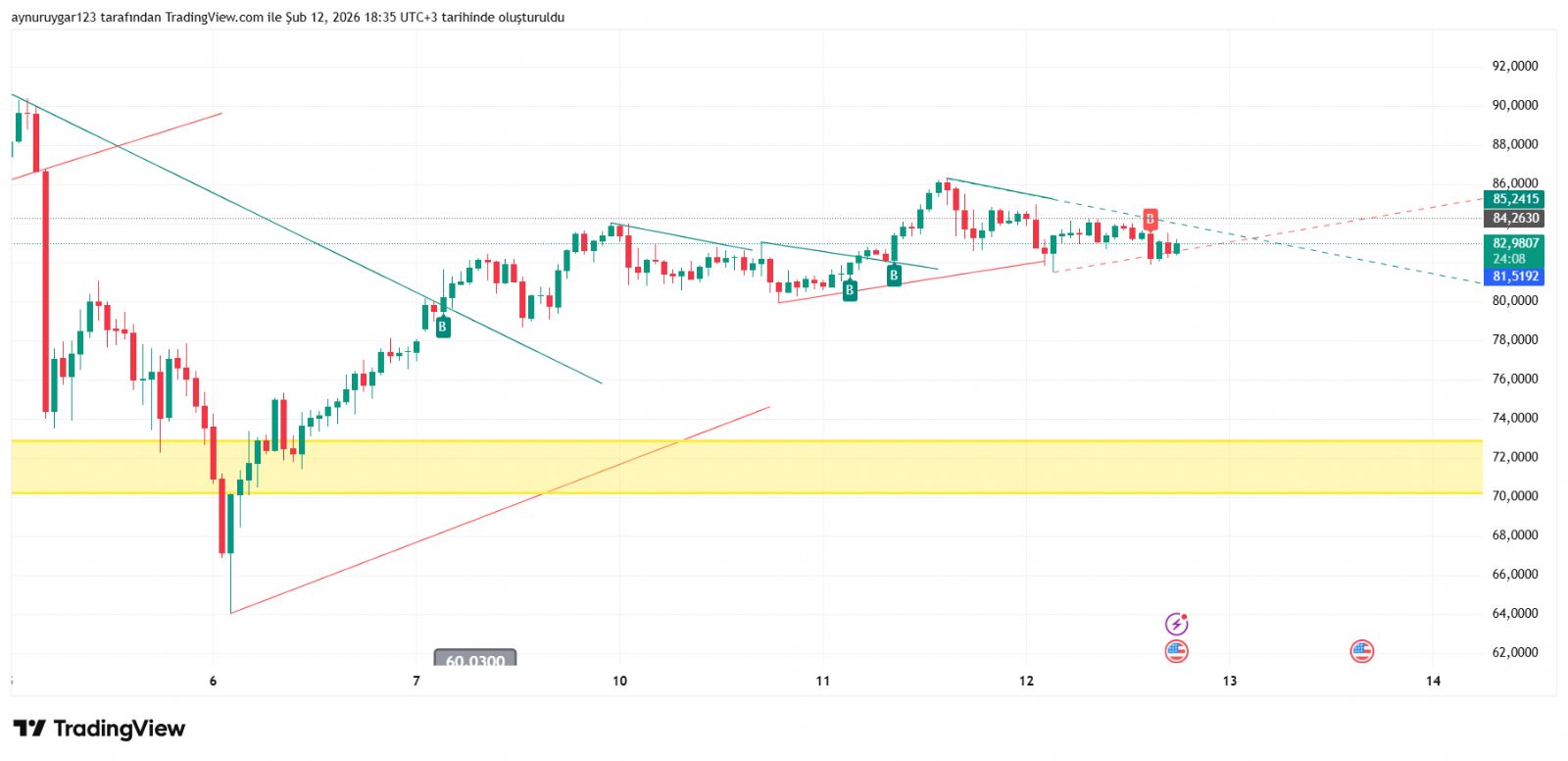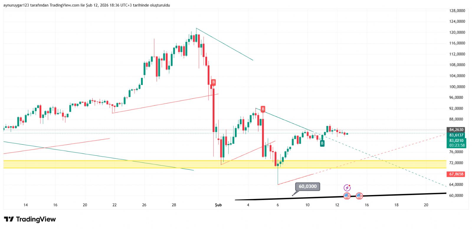 7. ons gümüş 2026 yıl icinde 84 altina inmemeli . yoksa 6 aylık yıllık mum fitile dönüşebilir.