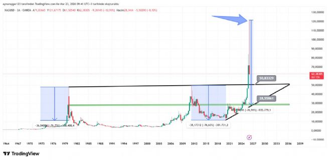 50 de tutunursa o uuzun yıllık trende retset yapmış olur ..ve yillar sürsede 121 den daha üst seviyeler gelebilir ..yıllar sürer bu ...50 tutar mı .. bende bilmem ..peki siz ne dersiniz ..sizin düşünceniz nedir 50 tutamaz 76% lik bir düşüş olursa 28..30 a denk geliyor ...tamda yükselişin başladiği yer ...