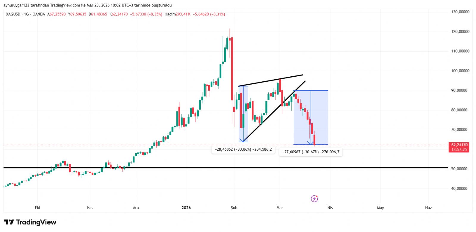 7. ons gümüş 2026 yıl icinde 84 altina inmemeli . yoksa 6 aylık yıllık mum fitile dönüşebilir.