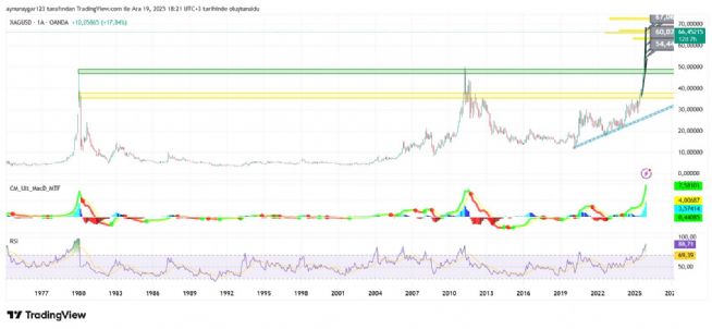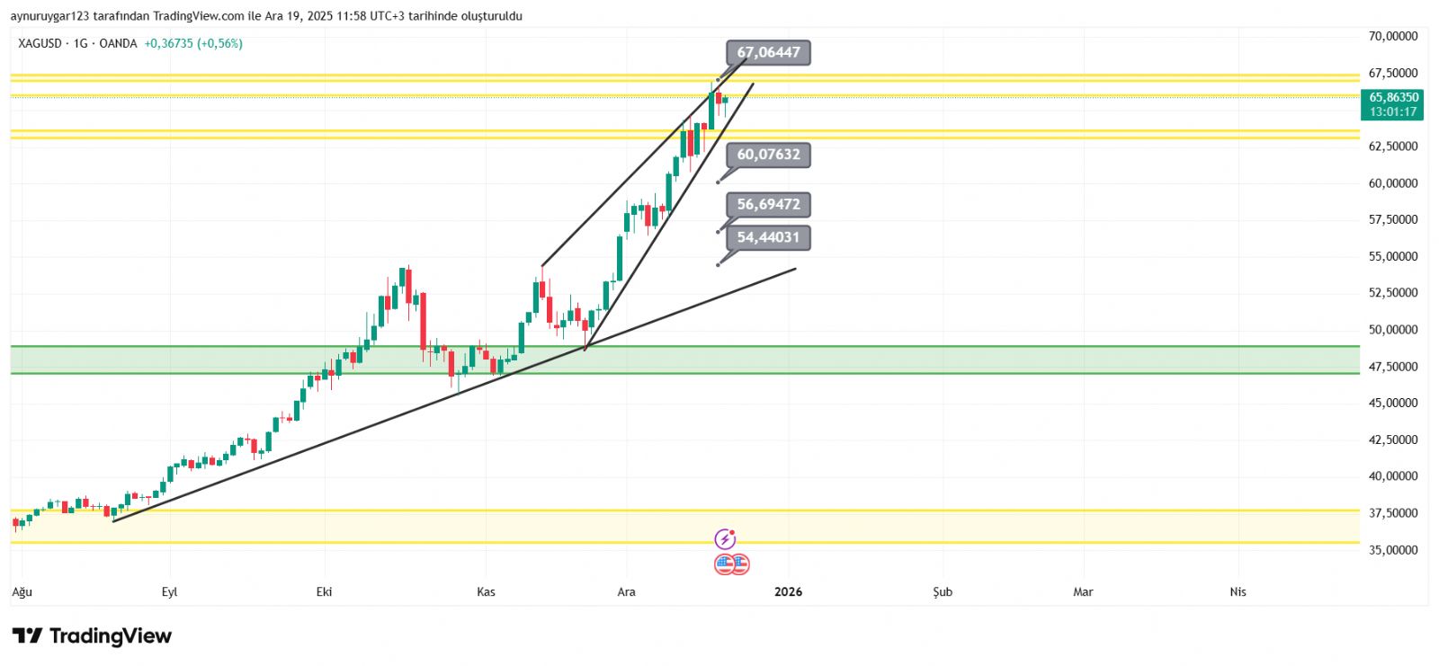 Gümüş için Aynur1 yorumu ()66 aylık direnç 67 3 aylık direnç .. tamda burada şu an ..11 gün sonra aylık 3 aylık 6 aylık kapanışlar olucak ..67 üstü mü alti mi bakıcağiz