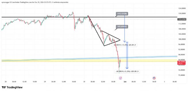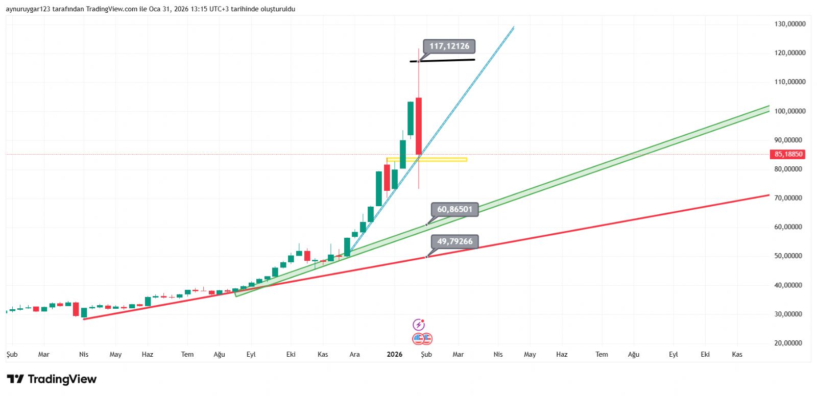 7. ons gümüş 2026 yıl icinde 84 altina inmemeli . yoksa 6 aylık yıllık mum fitile dönüşebilir.