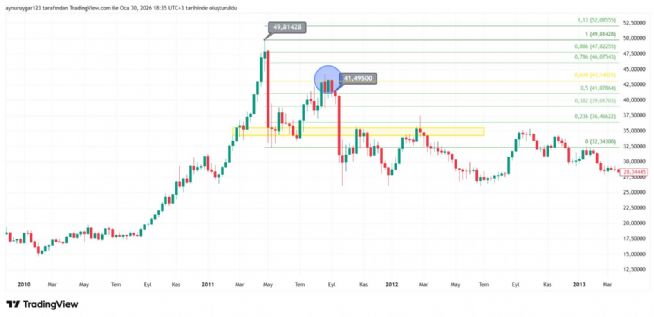 haftalık bazda 48 den 33 e kadar 15 dolar lık düşüşten sonra fibo altin oran 43.15 e kadar yükselmiş ..4 hafta orada durmuş ve uuuzun senelik düşüş 43 den başladı aslında ..