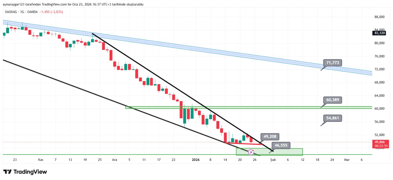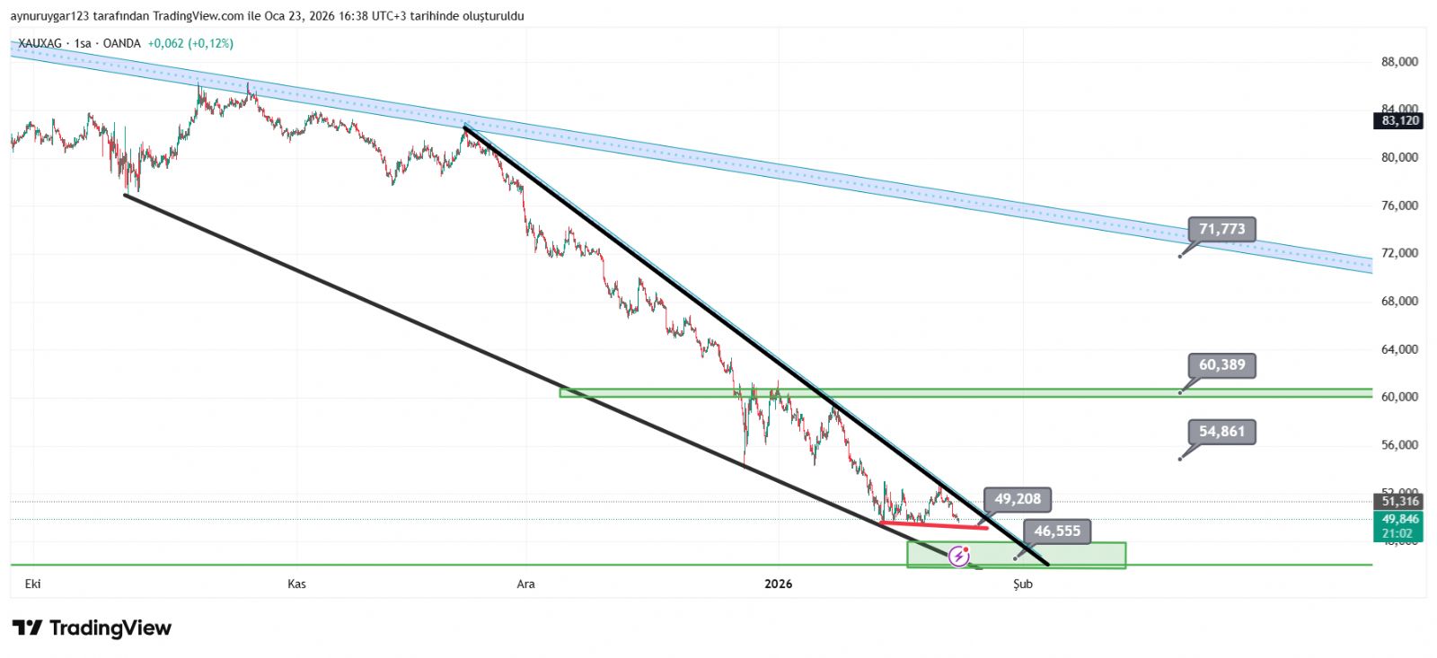 7. ons gümüş 2026 yıl icinde 84 altina inmemeli . yoksa 6 aylık yıllık mum fitile dönüşebilir.