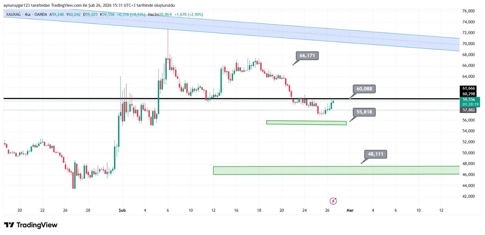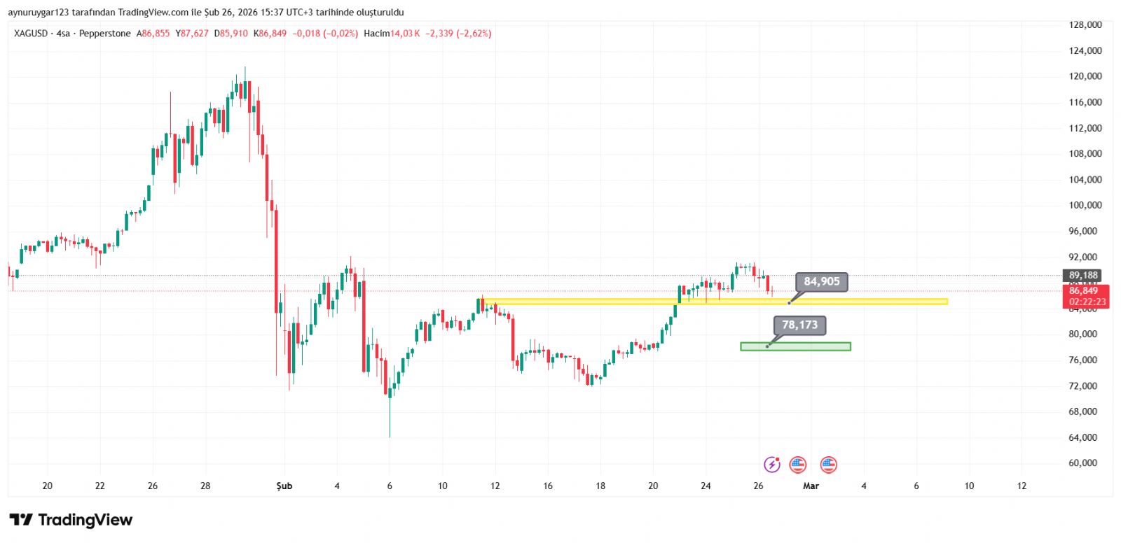 7. ons gümüş 2026 yıl icinde 84 altina inmemeli . yoksa 6 aylık yıllık mum fitile dönüşebilir.