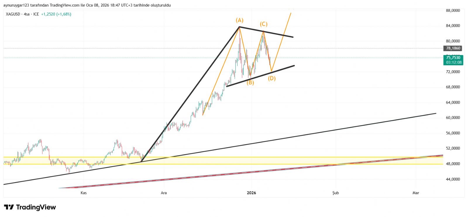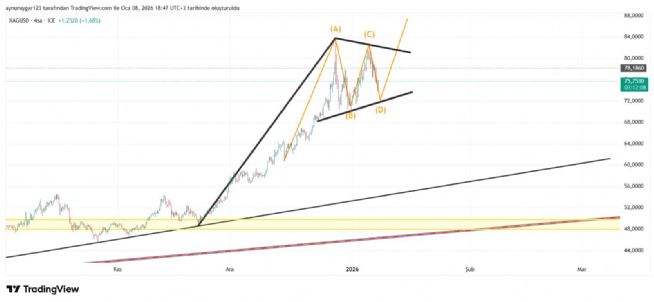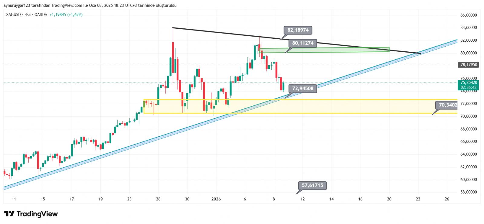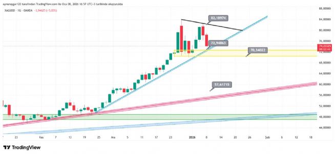 7. ons gümüş 2026 yıl icinde 84 altina inmemeli . yoksa 6 aylık yıllık mum fitile dönüşebilir.