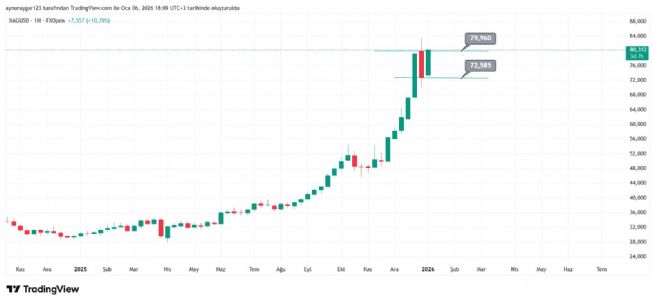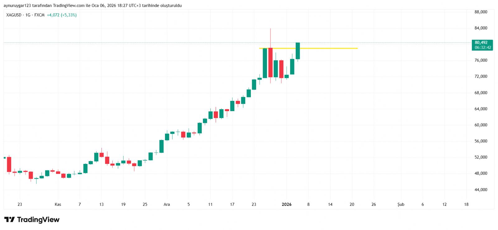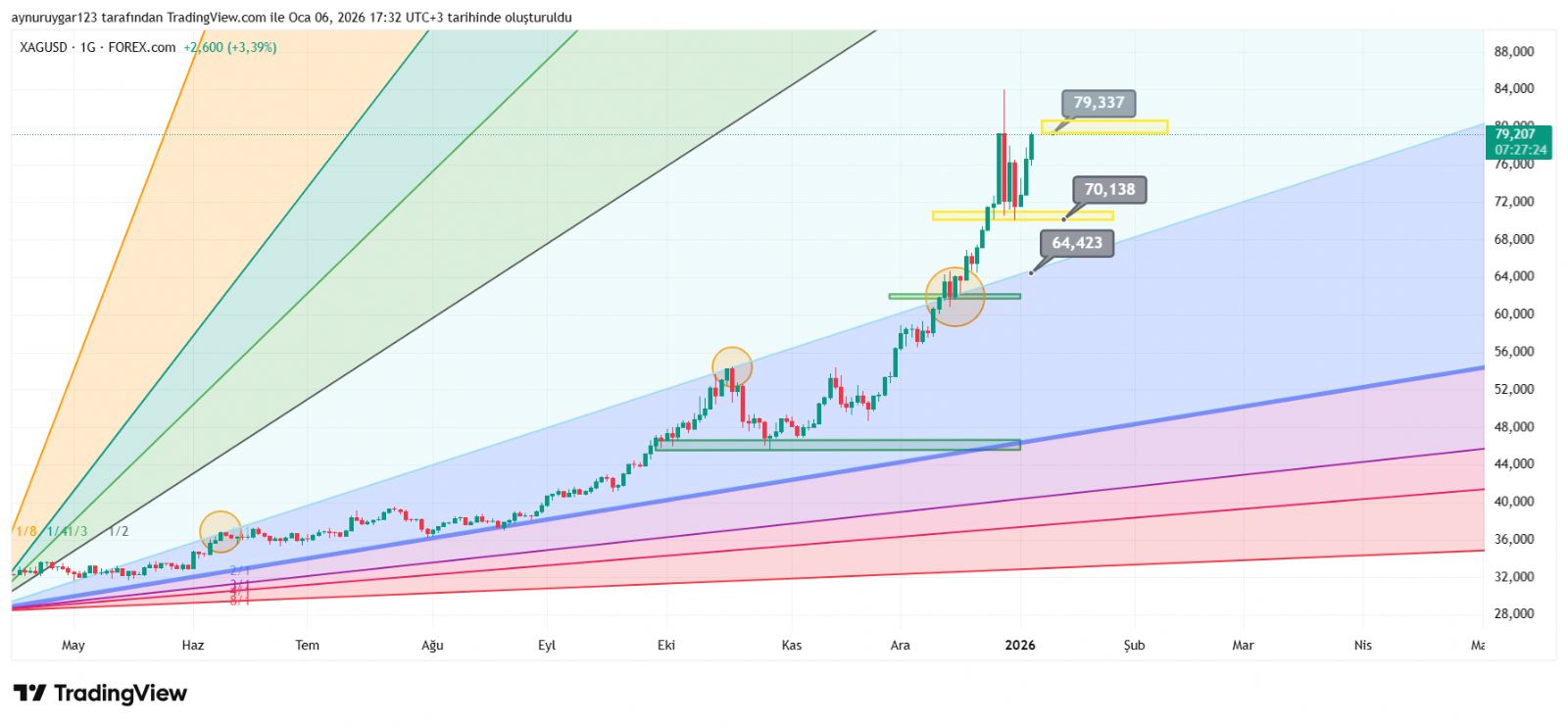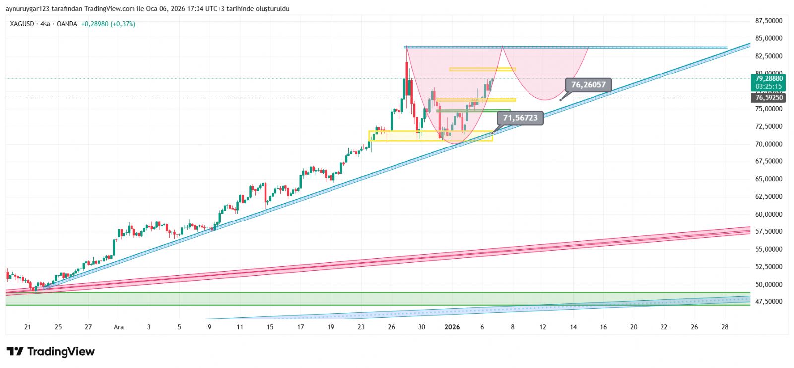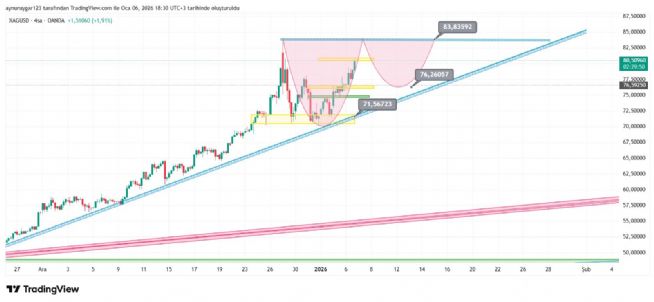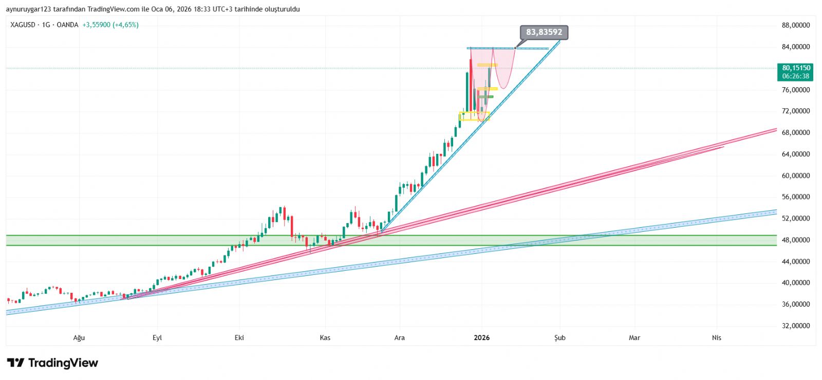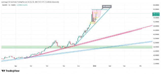7. ons gümüş 2026 yıl icinde 84 altina inmemeli . yoksa 6 aylık yıllık mum fitile dönüşebilir.