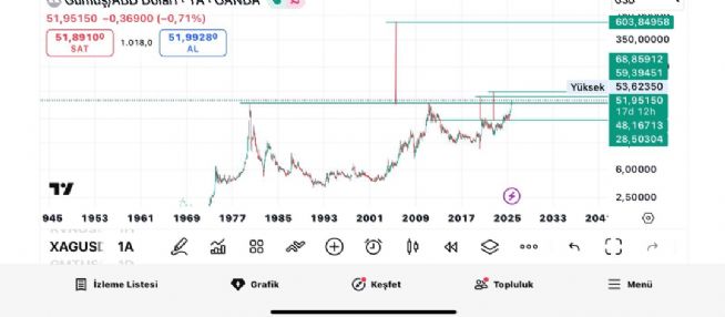 Gümüş için Boyno2727 yorumu ()Ben fikrimi defalarca söyledim burda gümüş 50 dolar üzeri günlük haftalık kapanışlar hepsini yaptı. tek aylık kapanış kaldı. Aylık kapanışıda yaparsa