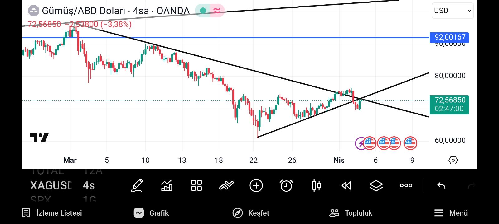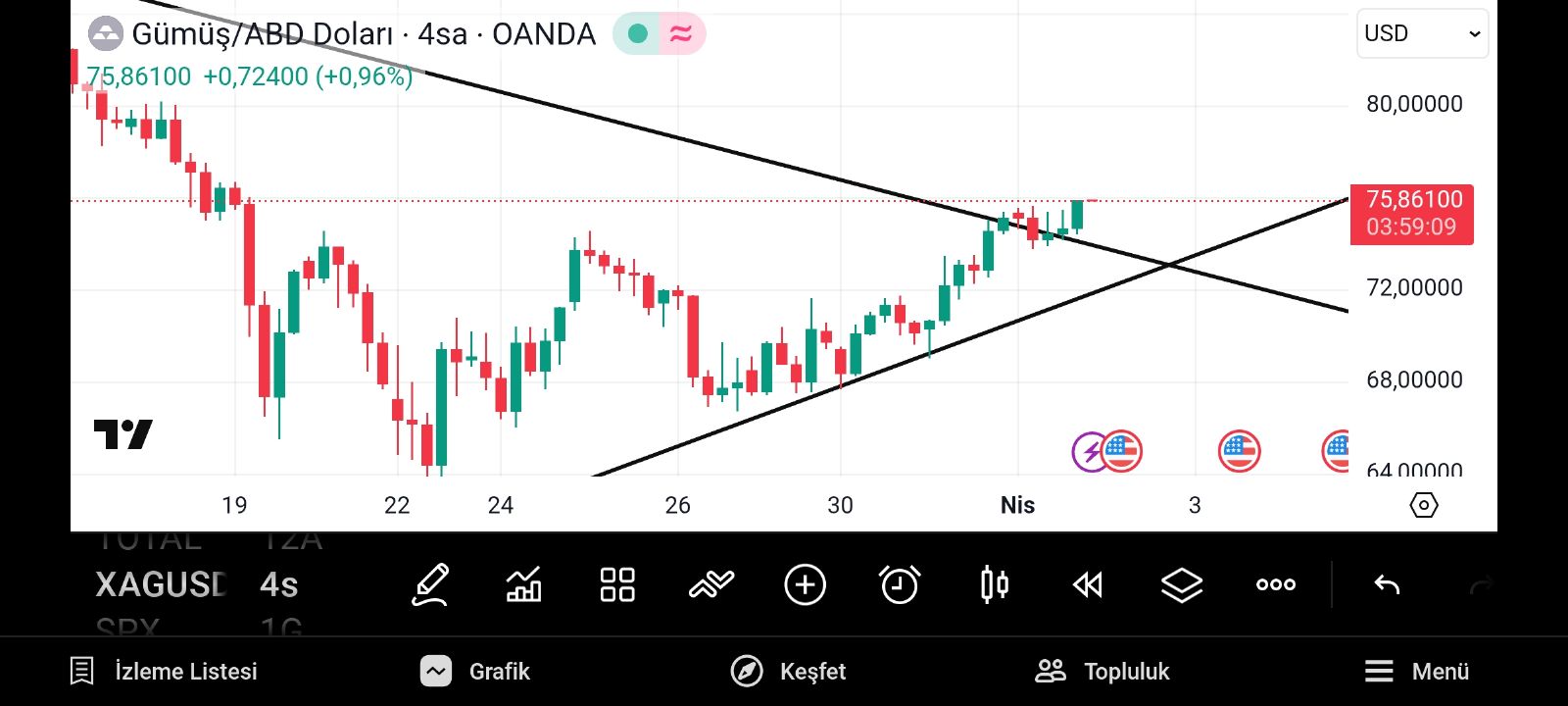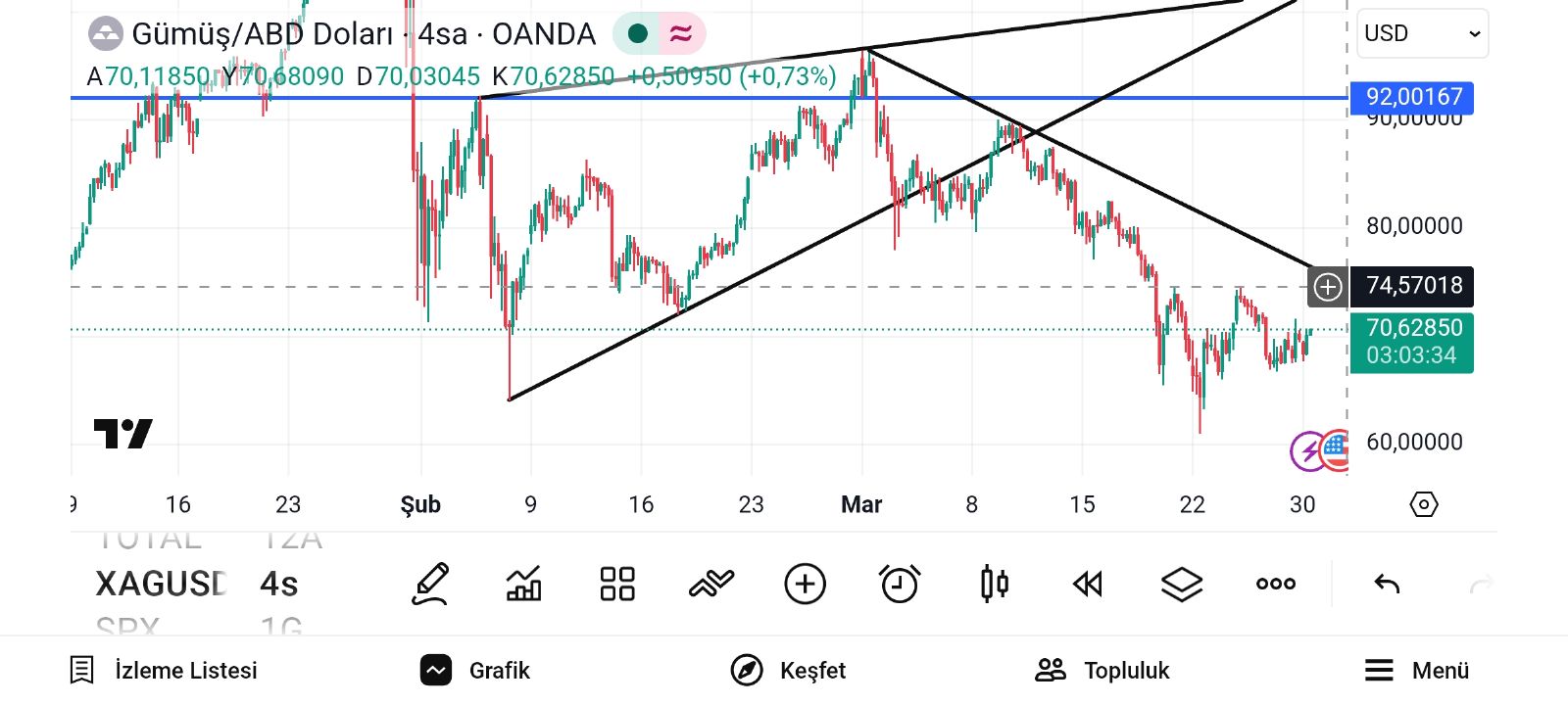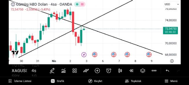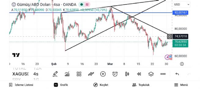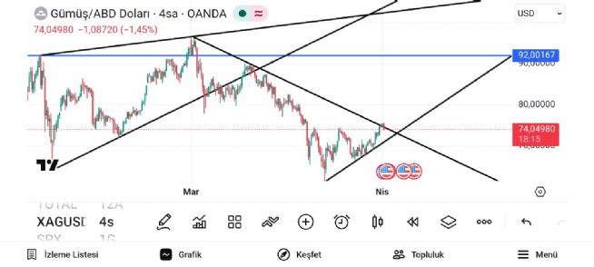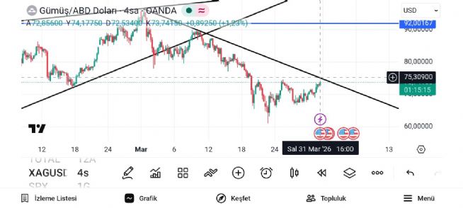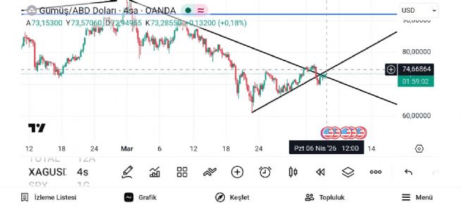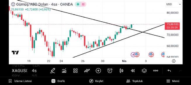 Gümüş onsun düşen hattın kırılımı 75.30 lardan geçiyor