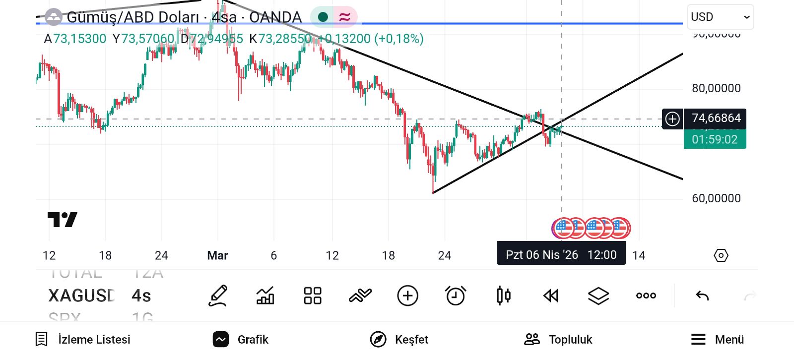 4 saatlik grafikte 74.66 hem daha önce direnç olarak çalışmış
