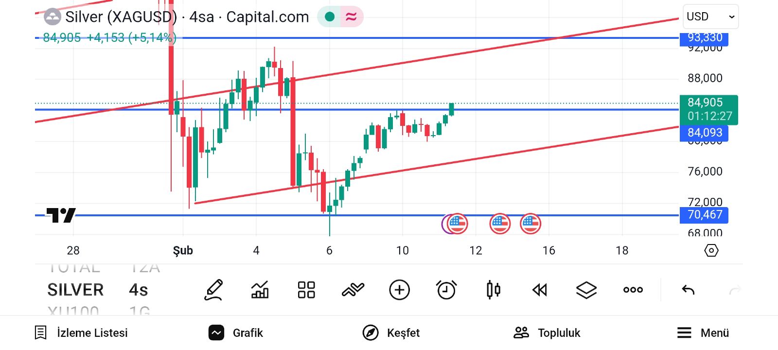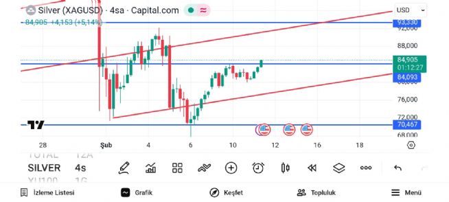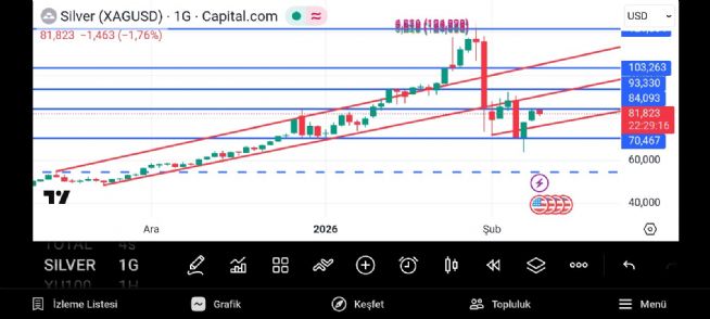 Gümüş için Boyno2727 yorumu ()Ben çok yükseklerden terste kalsaydım ne yapardım bir kere full işlem yapmaktan kaçınırdım direnç bölgelerinden parçalı satım yapıp geri dönüşlerde o parçalı sattığımı yerine koyar ortalamamı düşürürdüm