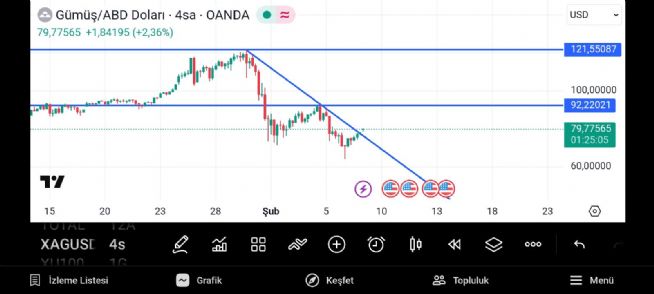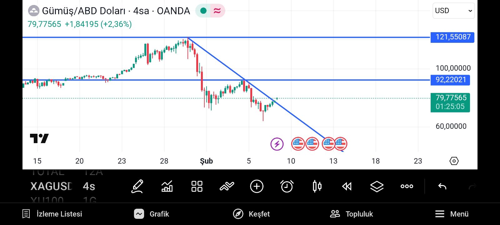 Günlükte güzel bir çanak oluşturursa Yükseliş daha muhteşem olacak bu çanak oluşabilmesi için 75 ile 95 arasında Gidip gelmesi lazım bu gümüşün yükselişini daha sağlıklı Hale getirecektir Benim izlediğim yol budur kesinlikle yatırım tavsiyesi değildir