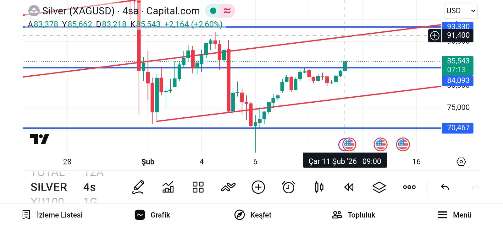 Gümüş için Boyno2727 yorumu ()Orta mavi çizginin üzerindeki hareketlerimiz devam ediyor 2.4 saat açılışımız Bunun üzerinde olması muhtemel kırmızı Yükseliş bölgesinin kanalının üst kısmının değdiği nokta 91.50 geçiyor ilk kademe satış bölgem 91.50