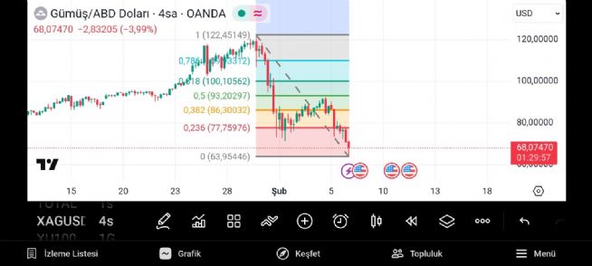 Gümüş için Boyno2727 yorumu ()Ama şunu da söyleyeyim Buralar zarar kes yapılacak yerler değil%35 %40 gibi bir zararı zarar kesme olmaz daha aşağılara düştükçe kademe kademe ekleme yapılıp ortalama düşürülmesi en uygun olan hamle olur