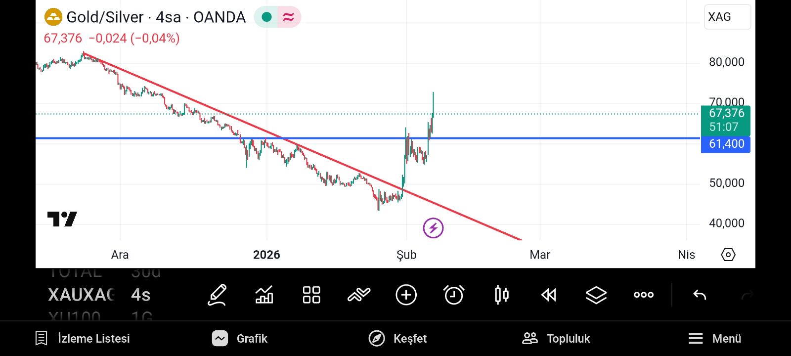 Altın 4400 leri tekrar bir yoklamak isterse rasyo yukarı uçar. Çünkü grafik manasında rasyonun üst tarafta yeri var gümüşte ozaman 60 65 arası süpriz olmaz yani