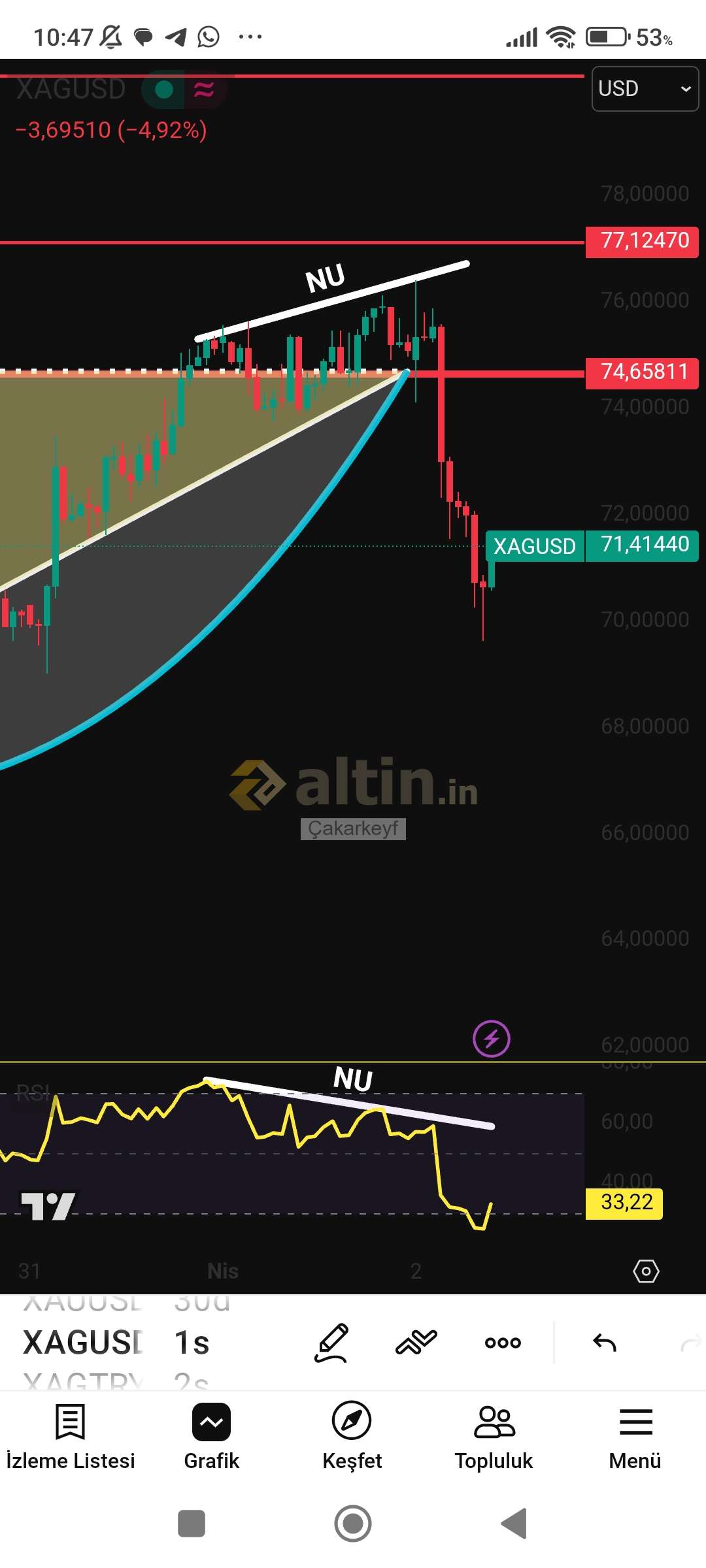 Gümüş için Çakarkeyf yorumu ()Nu( negatif uyumsuzluk ) fiyat yükselirken rsi da hacim yoktur yani fake bir yukselisi işaret eder düzeltme yada düşüş olması beklenir abim