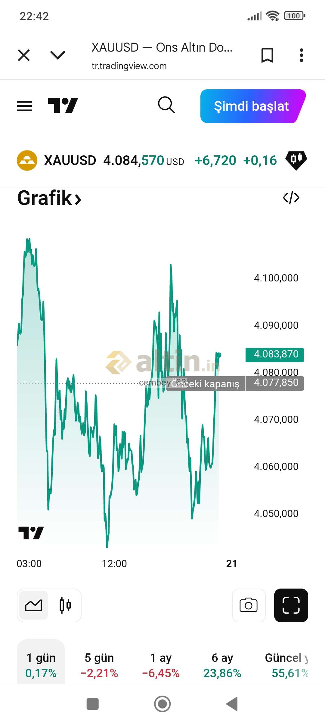 Gram Altın için cembey_63 yorumu ()Haftaya Ons 4100 üstüne atar . ve yükseliş serıne az bi zaman kaldı. Şimdiden herkese bol kazançlar dilerim.