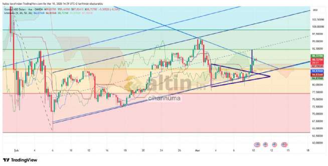3-9 Mart arası 4 saatlikteki gümüş onsta oluşan simetrik üçgen bilindiği gibi yukarı kırıldı, üçgen hedefi 92 ons.