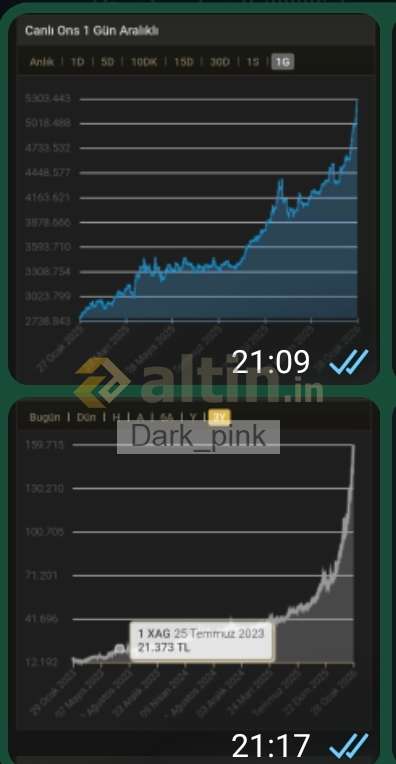 Gümüş ile aynı formasyon olursa şöyle anlatayım gümüş 160 bandında 80 bandına bakarsan altını n konumu gümüşü şu an bulunduğu konuma göre 80 90 bandında ama illaki aynı şekilde yükselecek diye bir kaydede yok formasyonlar benzer nacizane fikrimdir bu bir ayda da olur 1 yılda da olur şu an yönü haber akışları belirliyor ytd