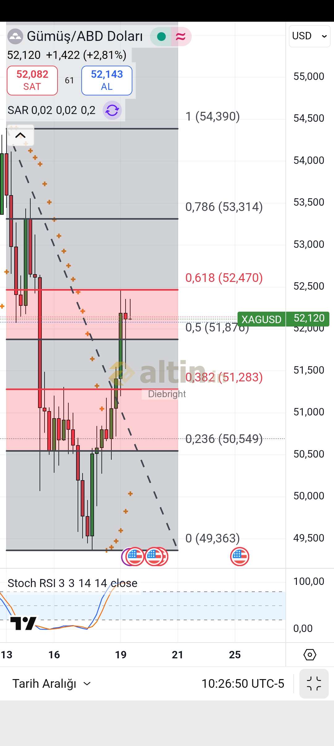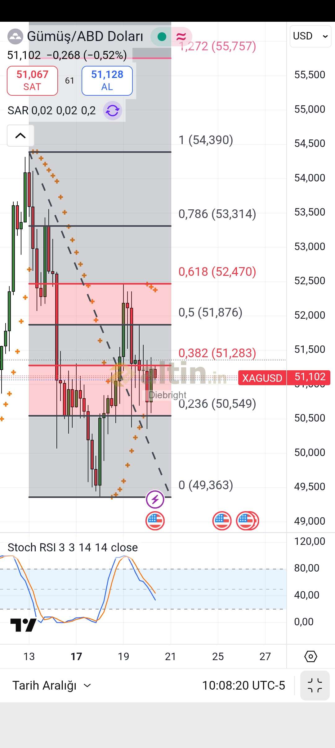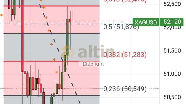 Dün fibo degeri olarak 52.47 usd noktasal denendi. Bugün ise bir alttaki 51.876 ve 51.28 usd denenmiş. Asagida da 50.55 usdye iğneler gelmiş. Biz yine de 50 usdye dikkati vereceğiz. 50 usd korundukca üst hedefler aktif. Şahsi düşüncem şu 4 saatlik gösterge dibe doğru gidiyor. Dip yapar da destek kırmaz ise çıkış gelir. Gunluk gösterge arada bir yerde. Günlükte altta iki yan yana sar desteği var. Genelde gumuste bu gösterge çalışıyor. 2 yan yana nokta gelirse son zamanlarda fiyatları yukarı taşıyor. Bu destek önceki dip olan 49.36 usd değerinde. Yani bugün 49.36 usdnin aşağısına gitmez 4 saatlik gösterge de dip yaparsa yarın tahminen 52.47 ve yukarısı denenebilir.