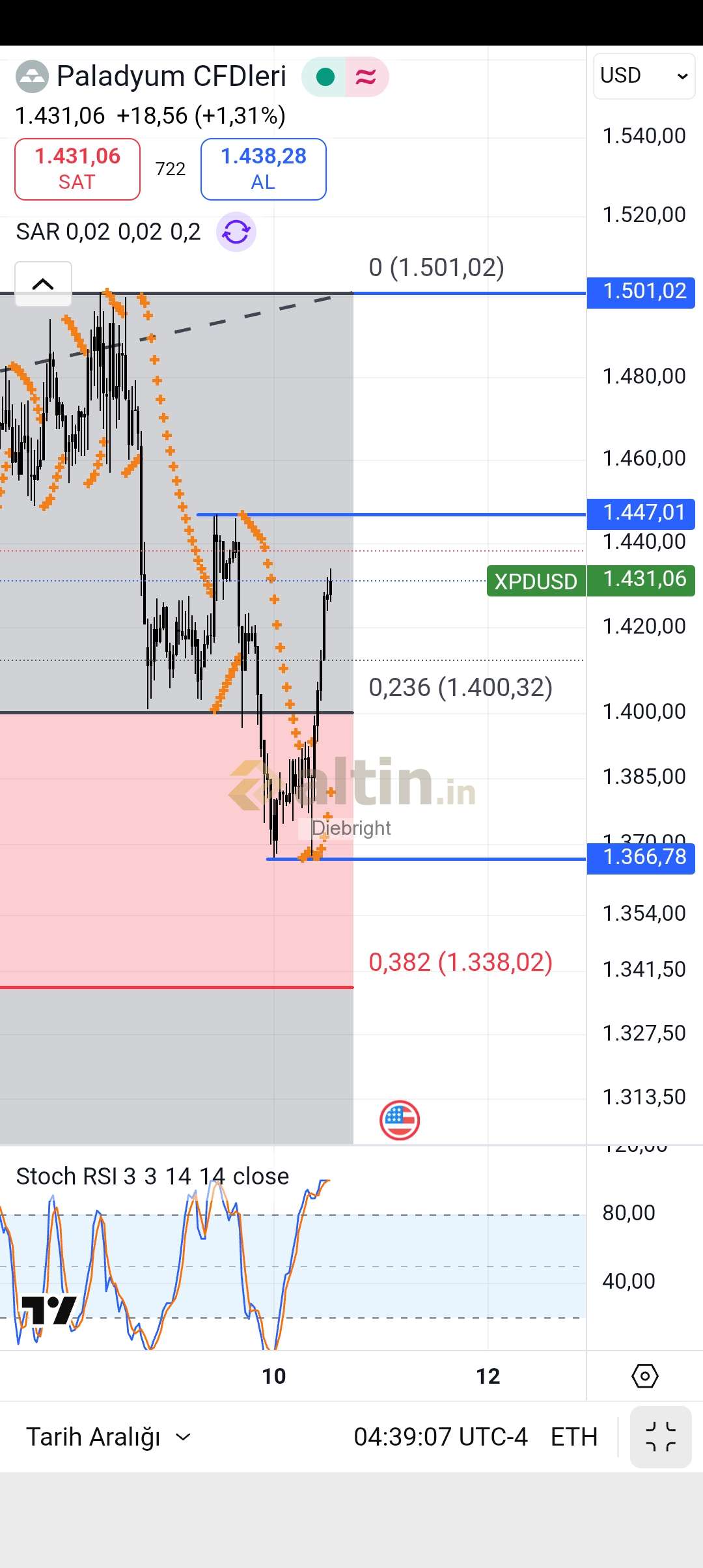 Platin için Diebright yorumu ()Gece 1447 usd gelmiş paladyumda. Dün terste kalan az bir miktar vardı. Gece denk geldi risk aldım bir miktar girdim ve 46.04 ile kâr alıp çıktım. Sabah toplamaya başladım. 1367 usdye düşmüş denk gelemedim fakat 44.7-44.9 arasi ufak parçalar ile giriş yaptım. 1400 usd üzerine atmalı. Yoksa 1338 usdye bir alt kademeye düşer.1378 usd şu an.