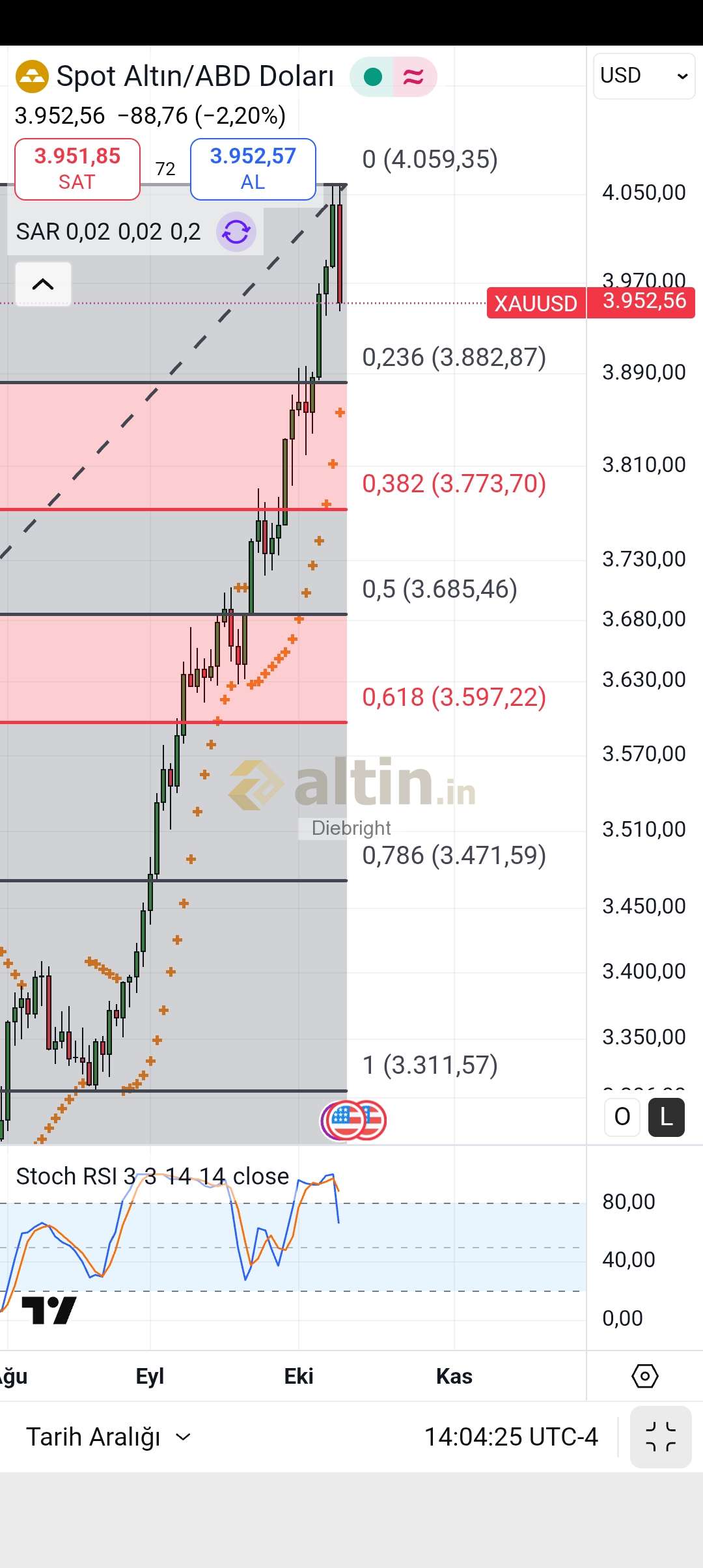 Altın ons aslında 4113 sonra düzeltme gelir diye bekledik. Maalesef gelmedi. 4059 usd yapmış. Yatay hattımız vardı 3121-3500 arasi. Aylarca sıkıcı bir yatay bant sürdü. Dip olarak 3121 demiyoruz. 3311 ile yükseliş başladı. Ve yükselen tepe dip yapa yapa 750 dolar yükseldi. Şimdi ilk düzeltme 3883 usdye olur. Daha düzeltme başlamadı onu da söyleyeyim. Eğer başlarsa fibo 0.5 muazzam alım yeri olur. Gelir mi bilmek zor. Burada geri yukarı bile yapabilir. Gunluk sar destegi de ilk düzeltme seviyesine yakın. Gosterge gunluk biraz gevşedi bu iyi.