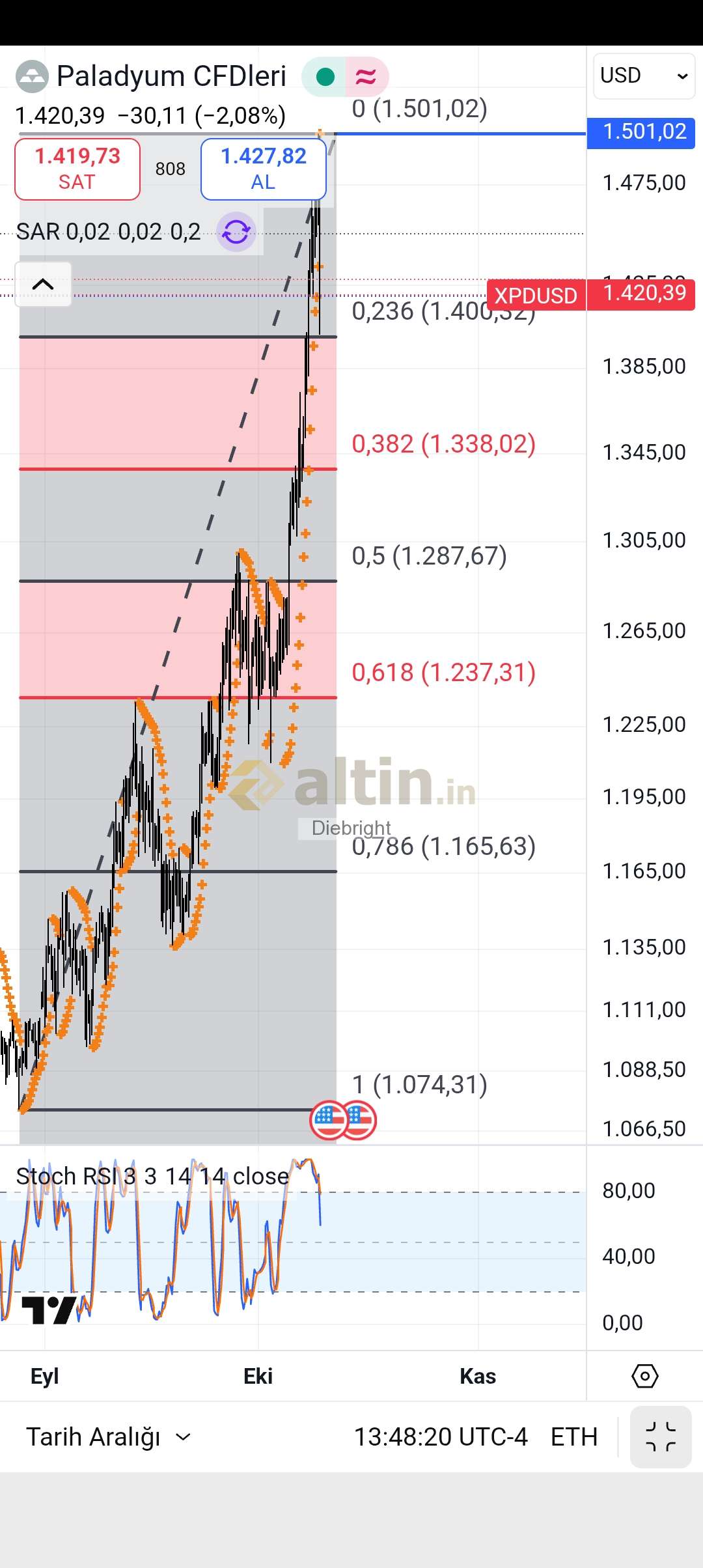 Bu fibolar sanırım paladyum için 1400 usd değerinde neden bir durakladigini anlatıyor. 1074 ten yükselen tepe dip yaparak başladı çıkışa. 1501 gordu. İlk düzeltme 1400 usd. Tam da oraya dokundu. Şimdi 1400 tutmaz ise 1338 usd var ki burası çıkarken de önemli dediğimiz 1336 usdye çok yakın. Eğer düşüş devam eder de 133x usd civarında durursa işte o zaman alınır.