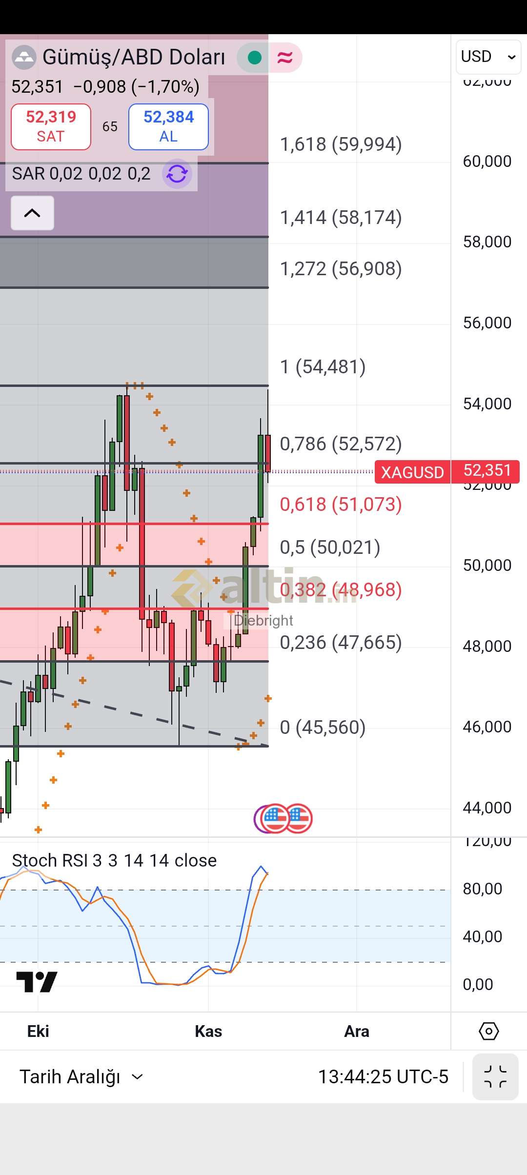 İkili tepe şartları olusmus gibi fakat bu 4 saatlik düzeltme için geçici bir geri cekipme de olabilir. Gunluk zirve yapmadı gösterge. 4 saatlik dip yapamaya yakın fakat sar tarafında iki nokta yan yana gelmiş. Dusus biraz daha devam eder işareti. Fiboya göre 52.57 üzeri kaldıkça 54.48 yine dener. 54.48 kalıcı olursa bir sonraki hedefi 56.91 olacaktır. 45.56 usd den taşıyabilen için 2 haftalık bir sürede %19 kâr usd bazlı çok büyük başarıdır.