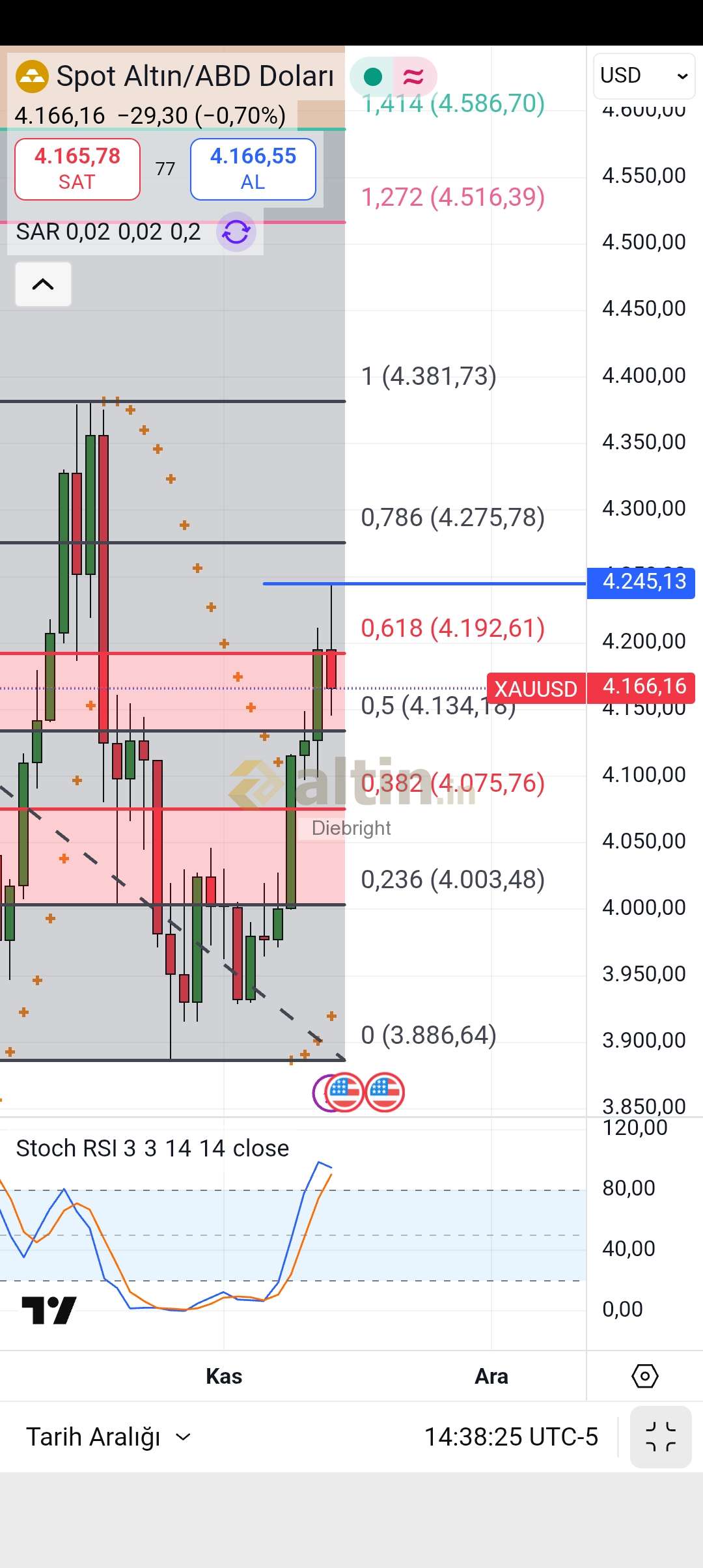 Altın gumuse göre düşüş ve yeni dip sonrasi geri dönüşte epey geri kaldı. Son düşüş ve yükseliş hareketine bakarsak. 500 dolar düşüş sonrası 360 usd yükseliş geldi. Fibo 0.786 seviyesi olan 4276 usdye de yaklaştı. Gunluk gösterge aşırı alıma gelse de tepe yapmadı. 4 saatlikte bir negatif uyumsuzluk vardı. Çalıştığını görüyoruz. Dip yaparsa uyumsuzluk bitmiş olacak. Sonra bakacağız artık. Gumus ikili tepe yaptı ve geri çekildi. Altın da 4193 usd uzeri en azından bir kapanis gelse fena olmaz. Haftalik grafige baktığımda 3886 usd dibi kırılmadıkca altin onsun orta vade yönü hala yukarı ve yeni rekorlar getirecek durumda.