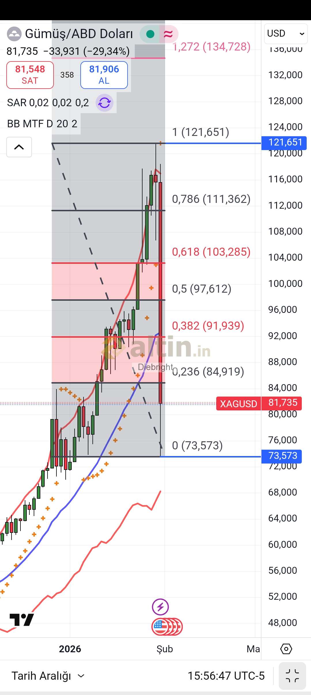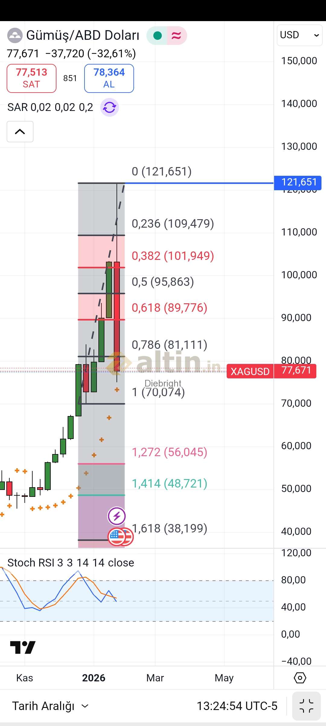 Altın onsta fibo değerimiz 5588 usd gibi son uzanim görünüyordu. Tabi grafiği paylaşma istemedim. 10 usd fark ile 5598 usdden satış gelmiş. Gümüş onsta da 122.x usd sonrasi düşüş beklentim vardı. 121.65 usd ile zirve yapmış. Tabi 116-118 usd arasında oyalanirken çoğunluk sattım. En son kalan miktarı da tekrar 121 hatta 122 gelir de satarız diye bıraktım kısmet olmadı. Satış yemesini düşündüğüm yerlerde satışlar gelmiş. Fakat satışın bu boyutta olacağını tabiki tahmin etmek imkansızdı. Altin için geri dönüş seviyelerine de bakarız şimdi.