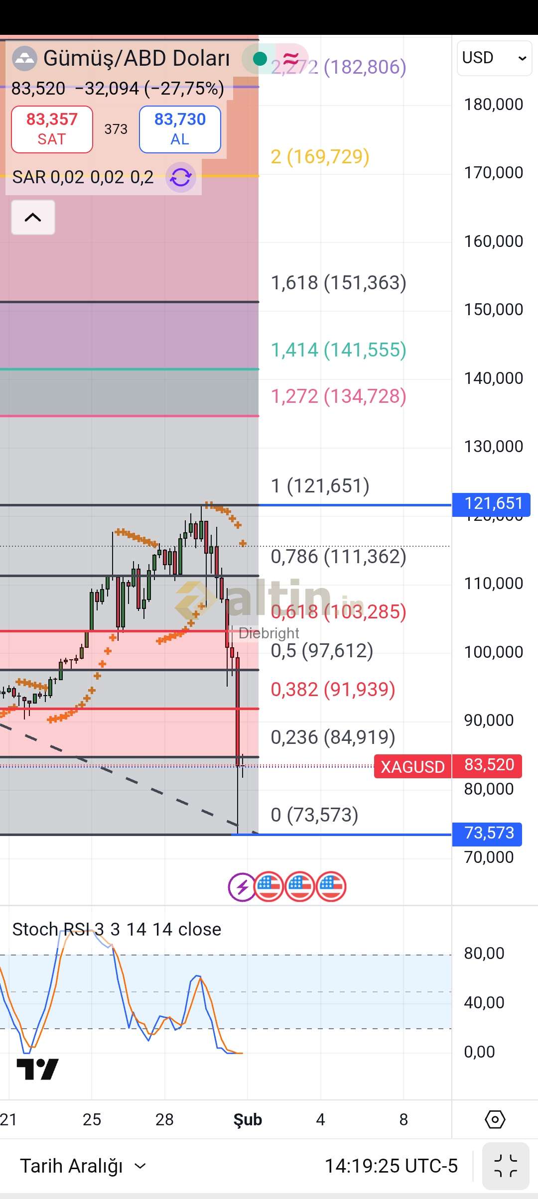 Haftalık grafik. Sar desteği 73.4 usd değerinde ve supertrend desteği de yakınında. Gümüş öyle böyle değil çok kritik bir yerden dönmüş. Kapadigi yer gelecek hafta için umutlu bir değer. Şu açıdan umutlu tepkiyi devam ettirebilir durumu oluşturmak için. Yani sırasıyla 84.91 usd üstündeki degerlere gidebilir. Hatta tekrar üç haneli dolar bazlı değerler gorebiliriz. Garantici olanlar gunluk gösterge dip yapsın sonra alırım diyebilir. Yok ben tepkiye oynarım diyenler için tepki zaten başlamış durumda. 4 saatlikte gosterge cılız bir geri dönüş başlatmış ve fibo degerlerinde de ilk tepki gelmiş. Hislerim bana bu iş gelecek hafta yukarı devam edebilir diyor. Gunluk göstergeyi dibe cekmeyebilirler bu durumda. Keşke yine 100 tl değeri ve aşağısı gelse dedik nerdeyse geldi. 168 tlden satıp 105 tl gibi alabilen varsa ciddi gram arttırdı. Bende de iyi gram artışı var fakat üstte az miktar bıraktık. İlk kez alacaklar veya ilave alım yapacaklar bence hafta sonu globaldeki haber akışını takip etsinler. Piyasa açılışını ptesi gece 02.00 gibi görsünler ondan sonra alım yapsınlar. Benim için 117 usdlerden fule yakin çıkıp 73 usdlerden almak büyük şans. 78 usdlerden alıp sattım 3 kg alttan 2 kg üstten toplan 5 kg var. Ancak çoğunlukla tl dolar bekliyorum. Hafta sonu dediğim gibi haber akışı ve gece 02.00 açılışını gorur belki de ful alırım.