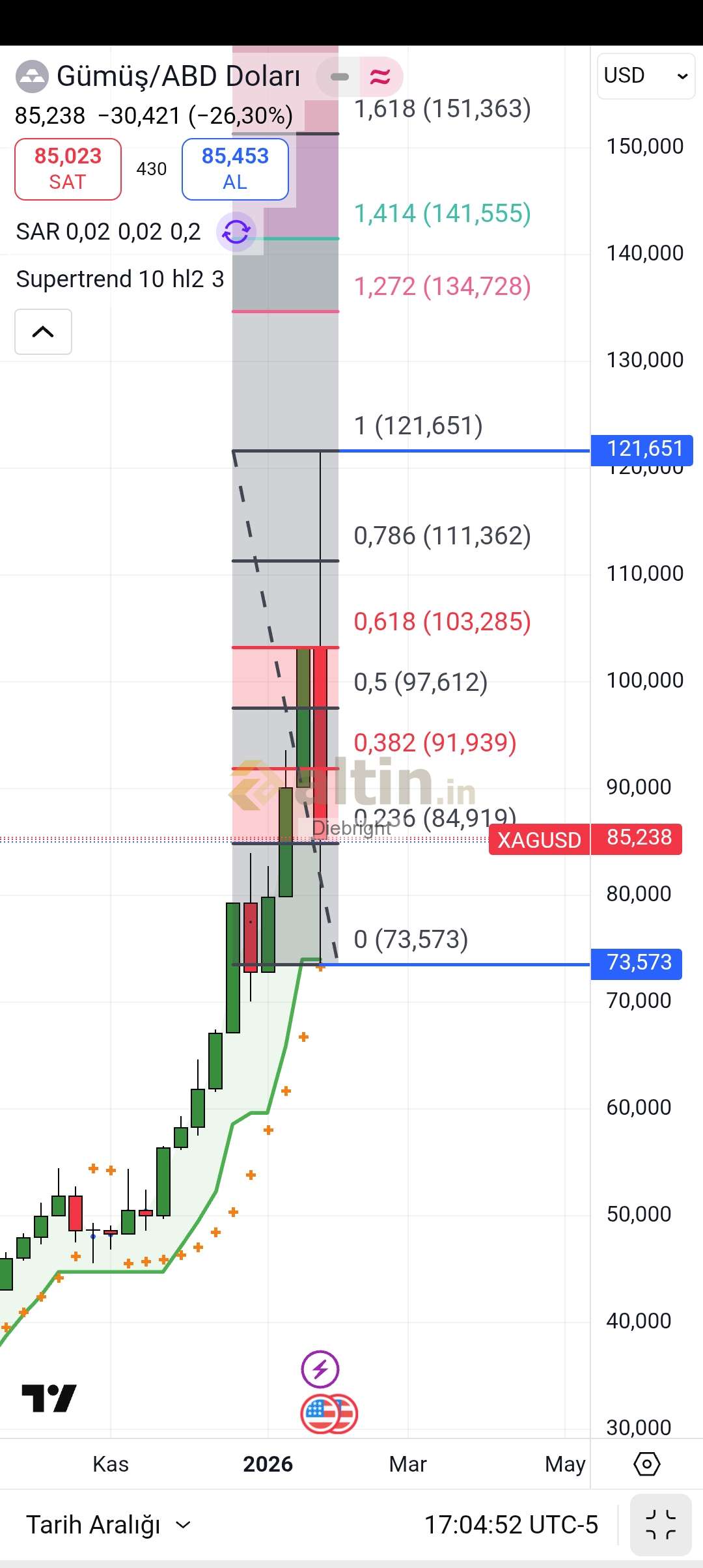 Gümüş için Diebright yorumu ()En kötü 84.92 usd hadi 85 usd üstünde kalmalı ki devam etsin yoluna. Şahsen ben artık tepkinin devamını beklerim. Fakat piyasa teknik öngörüden çok uzaklaştı.