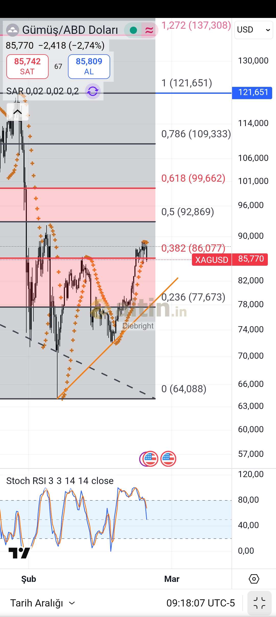Gümüş için Diebright yorumu ()86.08 usd ye bire bir dokundu. Bakalım tepkisi olacak mı yoksa kırıp aşağı mı gidecek.